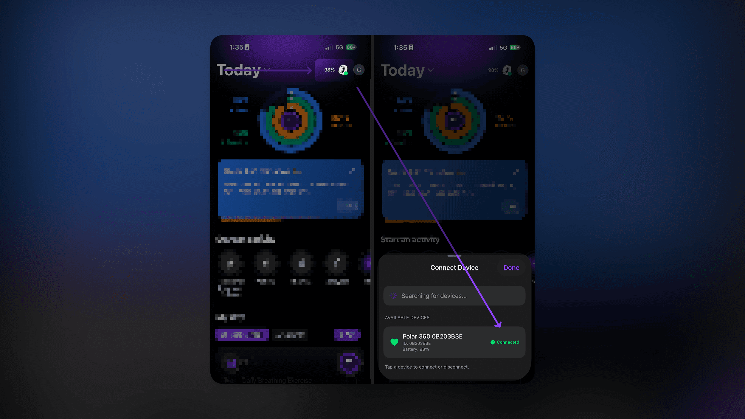 Then tap the band icon in the top-right corner to connect your band and click in connect. (screenshots below)
